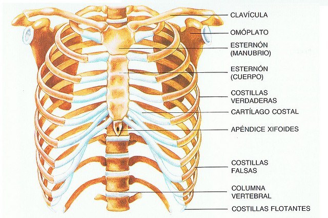 La caja torácica protege el corazón y los pulmones formando una especie de jaula. Está formada por 12 costillas a cada lado. Hay distintos tipos de costillas